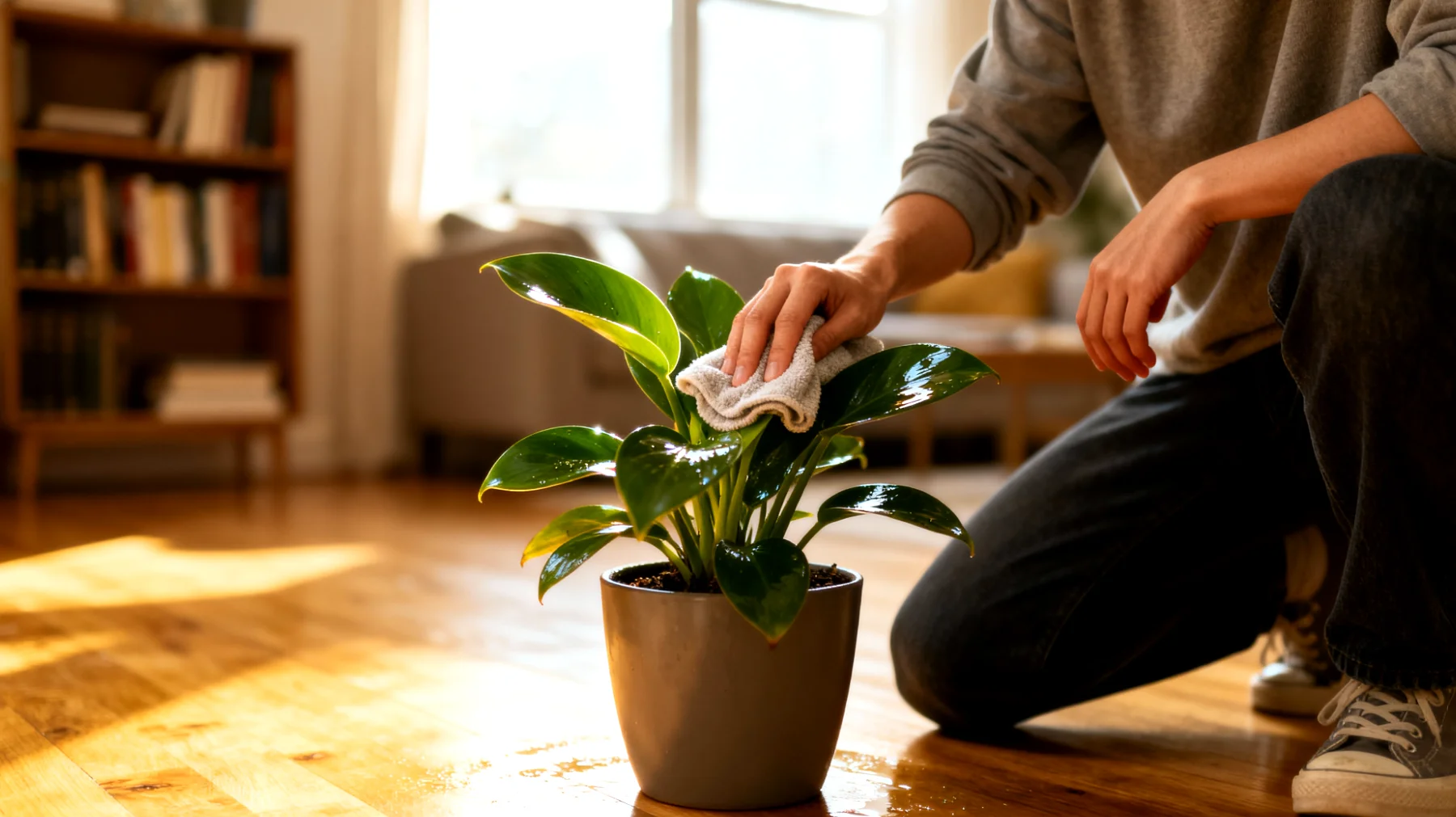 Bei dieser Gelegenheit empfiehlt sich eine kurze visuelle Kontrolle. Ein feuchtes Tuch über die Blätter zu wischen, entfernt Staubablagerungen, die sich über die Woche angesammelt haben. Dieser Schritt ist wichtiger, als viele glauben: Staub auf den Blättern reduziert die Lichtaufnahme erheblich, kann die Stomata verstopfen und damit die Photosynthese und Transpiration beeinträchtigen. Saubere Blätter sind leistungsfähigere Blätter. Die Kombination aus Drehen, Gießen und Blattreinigung wird so zu einem ganzheitlichen wöchentlichen Pflegeakt, der alle wesentlichen Bedürfnisse der Pflanze adressiert.