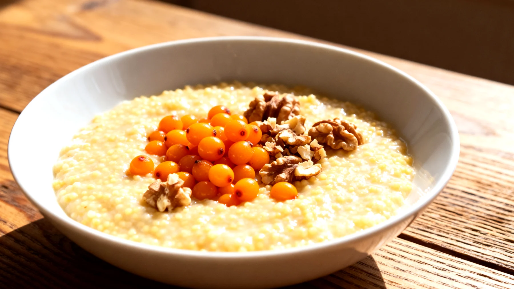Am Morgen wird die eingeweichte Hirse mit frischem Wasser oder Pflanzenmilch etwa 15 Minuten geköchelt. In dieser Zeit bleibt genug Raum für die morgendliche Routine. Die Walnüsse können grob gehackt und die Sanddornbeeren – frisch oder als Saft – kurz vor dem Servieren hinzugefügt werden, um hitzeempfindliche Vitamine zu schonen.