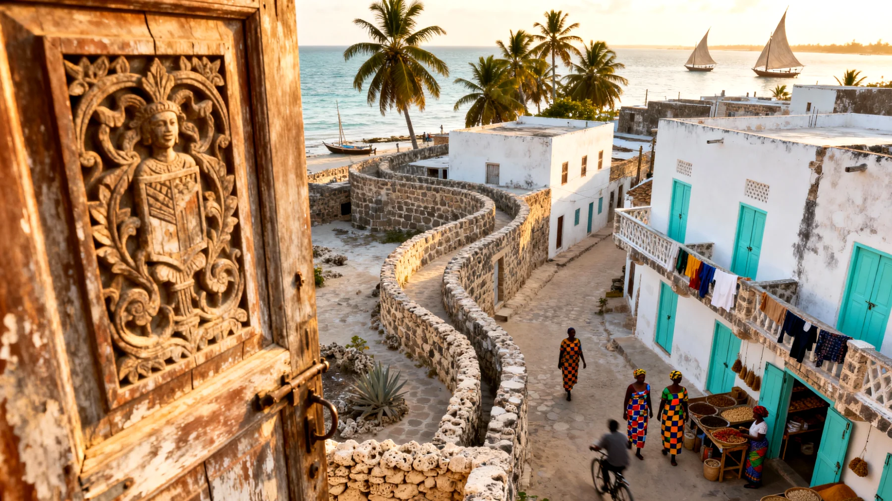 Lamu-Stadt, das historische Herz des Archipels, ist ein verwirrendes Labyrinth aus engen Gassen, in denen sich arabische, persische, indische und afrikanische Einflüsse zu einer einzigartigen Swahili-Kultur vermischen. Die jahrhundertealten Korallensteinbauten mit ihren kunstvoll geschnitzten Holztüren erzählen Geschichten von Handelsrouten und kulturellem Austausch. Wenn ihr durch die schmalen Pfade schlendert, werdet ihr feststellen, dass sich hier das Leben in einem Rhythmus abspielt, der anderswo längst verloren gegangen ist. Frauen in bunten Kangas sitzen vor ihren Häusern, Handwerker fertigen traditionelle Möbel, und der Duft von Kardamom und Nelken weht durch die Luft.